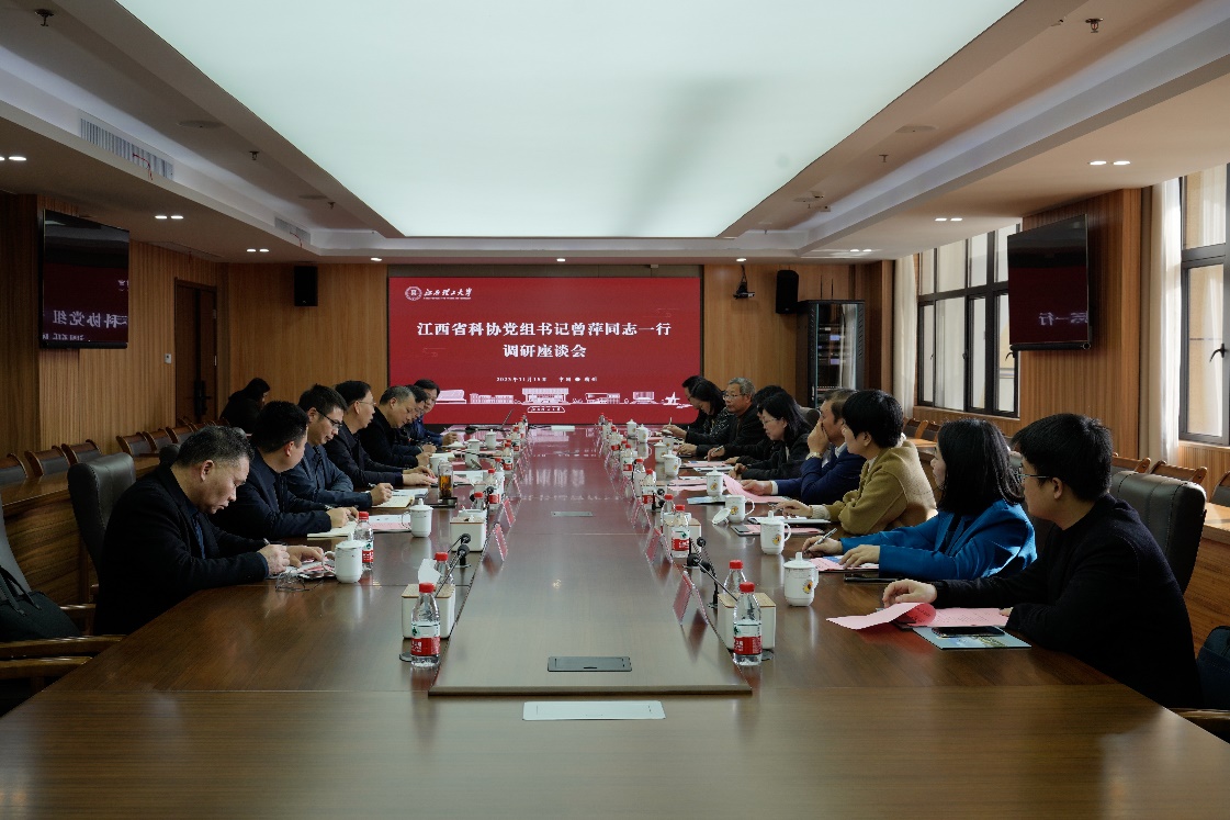 本网讯 11月15日下午,江西省科学技术协会党组书记曾萍来到学校考察调研科技人才工作,并调度和指导话剧《杨衍忠》的创排工作。校党委书记杨斌热情接见了曾萍一行,并举行座谈交流会。江西省科协宣传调研部部长张全市,赣州市科协党组书记、主席钟玉良,副主席肖维湘等陪同调研。校党委常委、副校长唐云志,科学技术处、校团委等部门负责人以及快猫