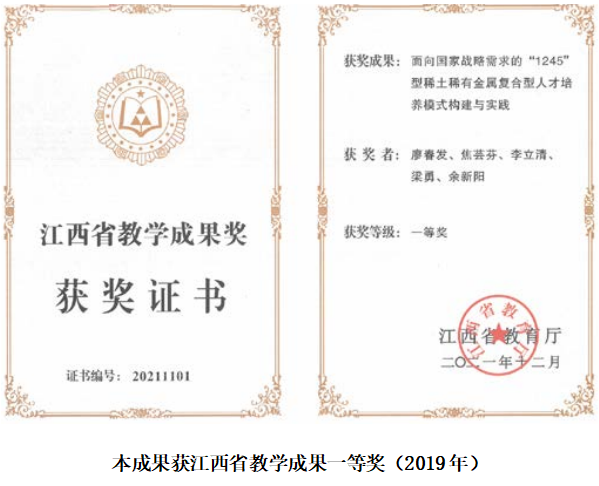 学院形成的“1245”稀土稀有金属复合型人才培养体系、课程体系、实践体系、育人模式等系列成果,被中南大学等10余所地方高校借鉴与采纳,在行业高校中产生很大影响,示范作用显著。