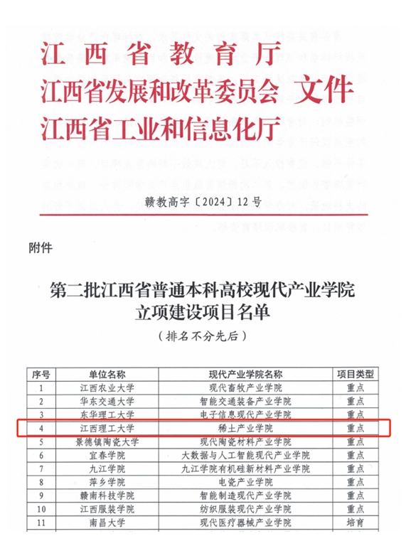 本网讯 近日,省教育厅、省发展和改革委员会、省工业和信息化厅联合下发《关于公布第二批江西省普通本科高校现代产业学院立项建设项目名单的通知》,快猫 申报的“稀土产业学院”成功获批第二批普通本科高校现代产业学院立项建设重点项目。