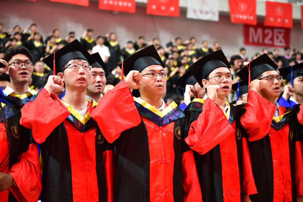 2024届毕业生,毕业之际我庄严宣誓:传承红色基因,弘扬校训精神;牢记理工家训,践行三实品质……”“告别了家乡亲切的明月,迎来了校园灿烂的朝阳……我们从这里启航,去拥抱明天的太阳!”毕业典礼在一句句铮铮誓言和校歌《我们从这里启航》的合唱声中落下帷幕。现场全体领导、老师、研究生和亲友团朋友们一同起立,挥手深情目送本科毕业生们“出发”。