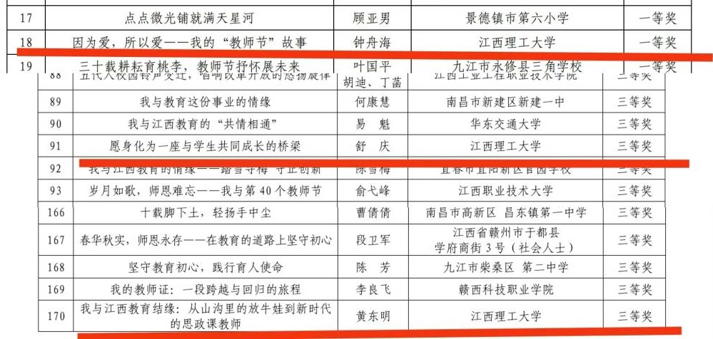 经学校遴选推荐、专家组评审,快猫 教师钟舟海作品《因为爱,所以爱——我的“教师节”故事》荣获一等奖,舒庆作品《愿身化为一座与学生共同成长的桥梁》、黄东明作品《我与江西教育结缘:从山沟里的放牛娃到新时代的思政课教师》荣获三等奖。