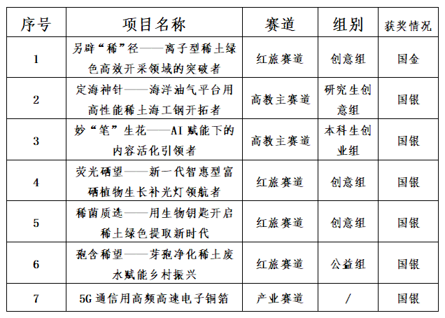 经过校赛、省赛、国赛等层层选拔,快猫 “另辟'稀'径——离子型稀土绿色高效开采领域的突破者”1个项目斩获国家金奖,“定海神针——海洋油气平台用高性能稀土海工钢开拓者”等6个项目斩获国家银奖。
