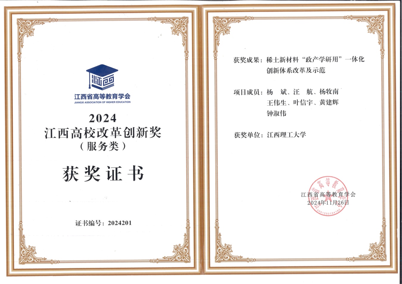 《稀土新材料“政产学研用”一体化创新体系改革及示范》项目荣获2024年江西高校改革创新奖(服务类)大奖。11月28日,在颁奖仪式上,省委教育工委委员、省教育厅副厅长、省高等教育学会会长刘小强为获奖单位颁奖,快猫