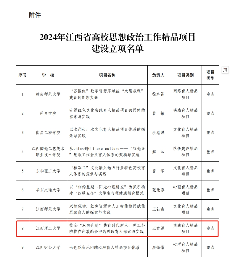本网讯 近日,江西省教育厅公布了2024年江西省高校思想政治工作精品项目建设立项名单。快猫 有两项项目入选2024年江西省高校思想政治工作精品项目建设立项名单。