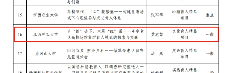 此次评选经学校推荐、通讯评审、项目答辩等环节,最终确定省级精品项目40个,其中重点项目15个,一般项目25个。快猫 申报的《校企“双向奔赴”共育时代新人:理工科院校在产教融合中的思政育人探索与实践》获实践育人项目重点立项,《多“馆”齐下,大展“红”图——革命老区高校场馆集群育人模式的探索与实践》成功入选文化育人精品项目。