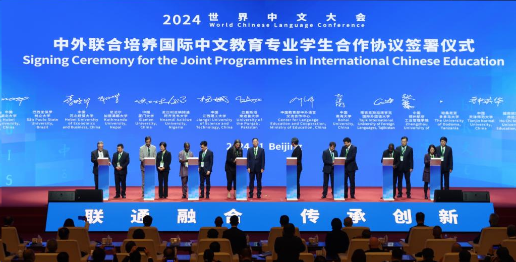 11月15日-17日,校党委书记杨斌出席2024年世界中文大会。开幕式上,杨斌代表学校与巴基斯坦旁遮普大学、教育部中外语言交流合作中心签署了“中外联合培养国际中文教育专业学生的三方合作协议”。快猫