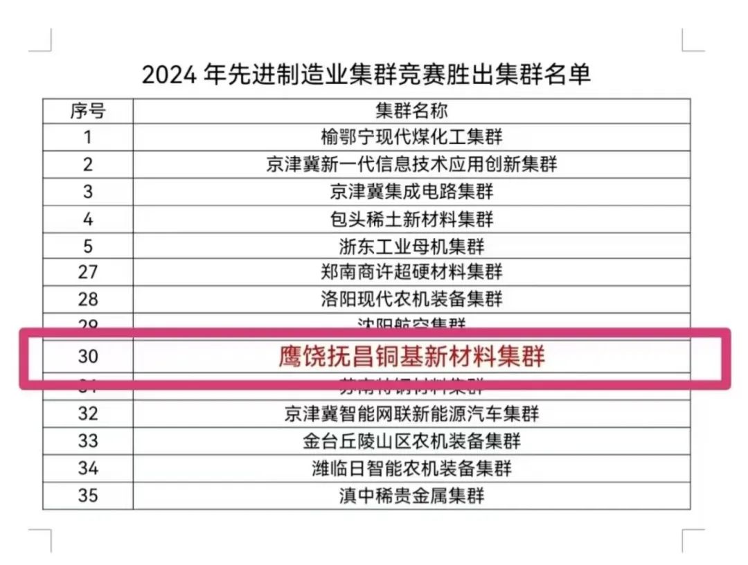 以“一个集群促进组织、一个产业联盟、一个制造业创新中心、一所现代产业学院”的“四个一”全力助推鹰饶抚昌铜基新材料集群成功上榜2024年国家先进制造业集群名单。