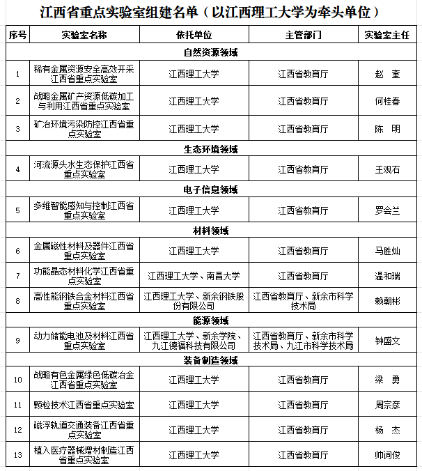 学校牵头申报的先进金属材料及关键矿产开发江西省实验室,组建方案已经省委常委会会议和省政府常务会议审议通过;牵头组建13个江西省重点实验室,组建数量位居全省第二。近年来,学校积极服务江西“1269”行动计划,面向江西重点产业强化技术攻关,聚焦产业培育加强成果转化,加快推动科技创新和产业创新深度融合,有效支撑科技强省建设,为实现江西有色金属、电子信息、新能源等产业链的高质量发展贡献江理力量。