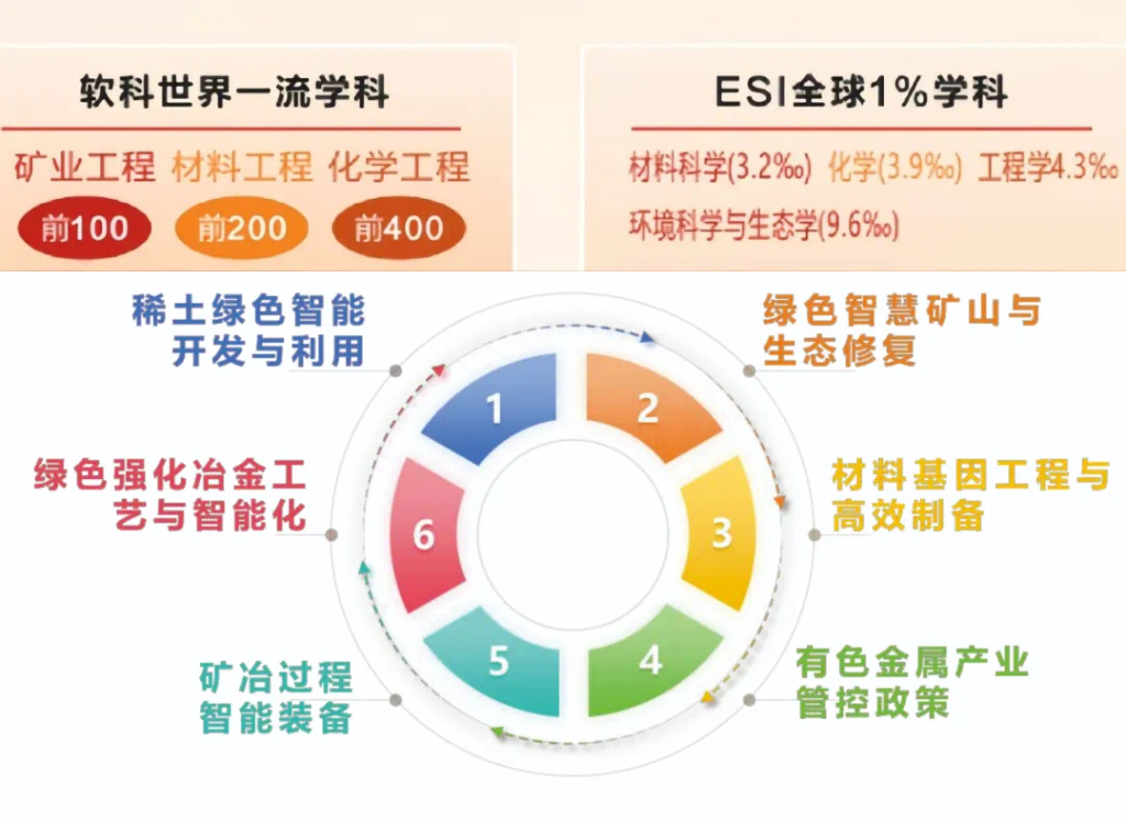 2024年,学校新增材料科学与工程1个一级学科博士点,资源与环境、材料与化工2个专业学位博士点,6个专业学位硕士点,专业学位博士点总数位居全省第二,“密码”硕士点填补我省空白;3个省一流建设学科持续上榜软科中国最好学科排名,矿业工程位居软科排名全球第40位,冶金工程进入全球百强;材料科学进入ESI全球前3.1‰、工程学3.8‰、化学4.1‰,环境与生态学首次进入全球前1%,高被引论文数位列全省高校第二。