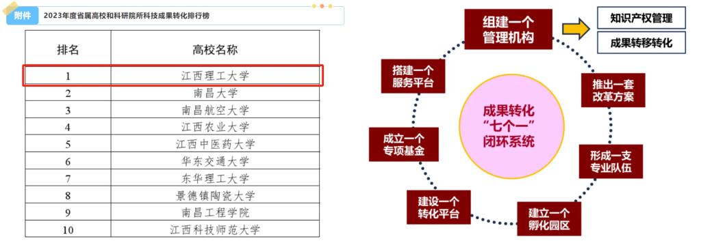 7.科技成果转化工作位列2023年度省属高校排行榜榜首,其中“七个一”科技成果转化模式成为江理智慧名片。