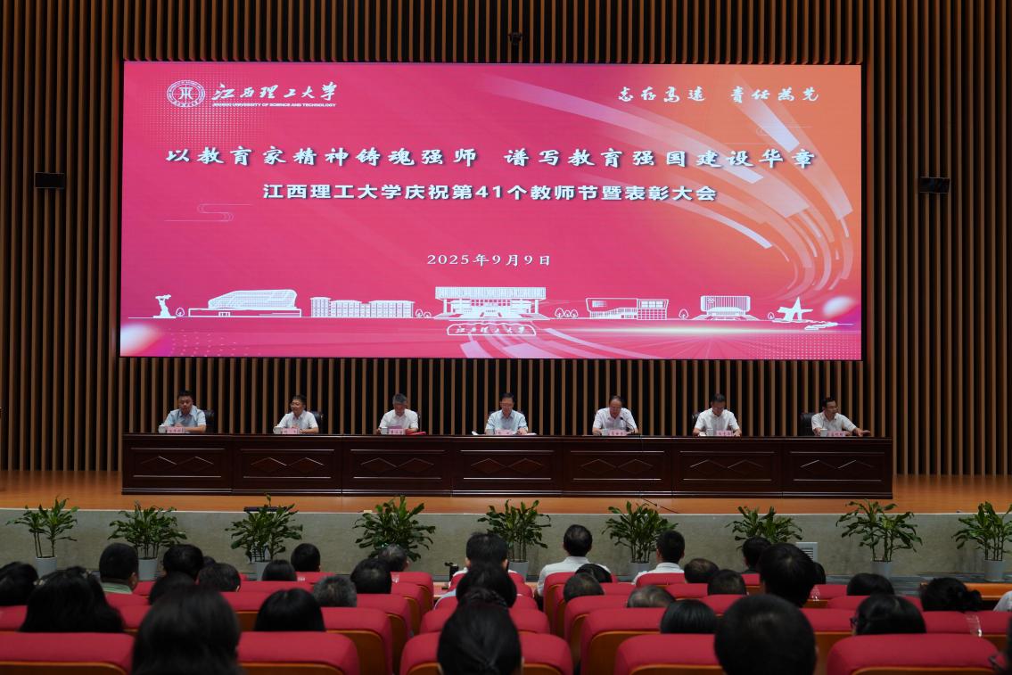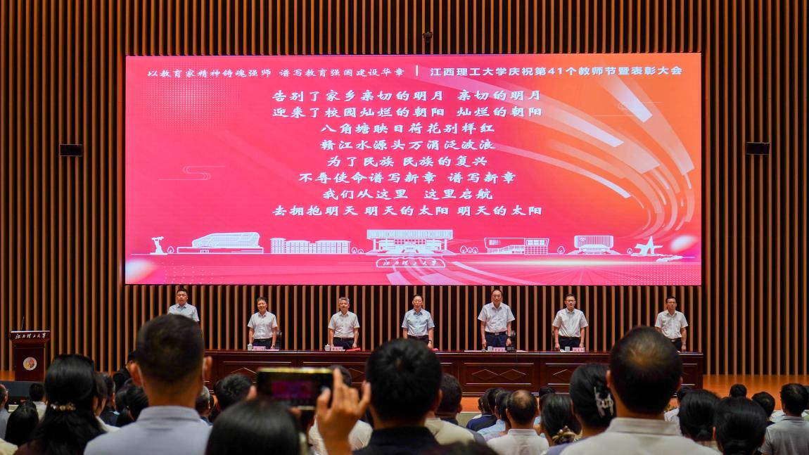 庆祝第41个教师节暨表彰大会在三江校区东园志远会议1号厅召开,南昌校区、先进铜产业学院(鹰潭)分会场同步视频参加。全体在家校领导、党委常委、赣州校区各学院党政主要负责同志、南昌校区管委会全体班子成员、先进铜产业学院(鹰潭)全体班子成员以及各校区教师代表参加会议。大会由中国工程院院士、校长葛世荣主持。