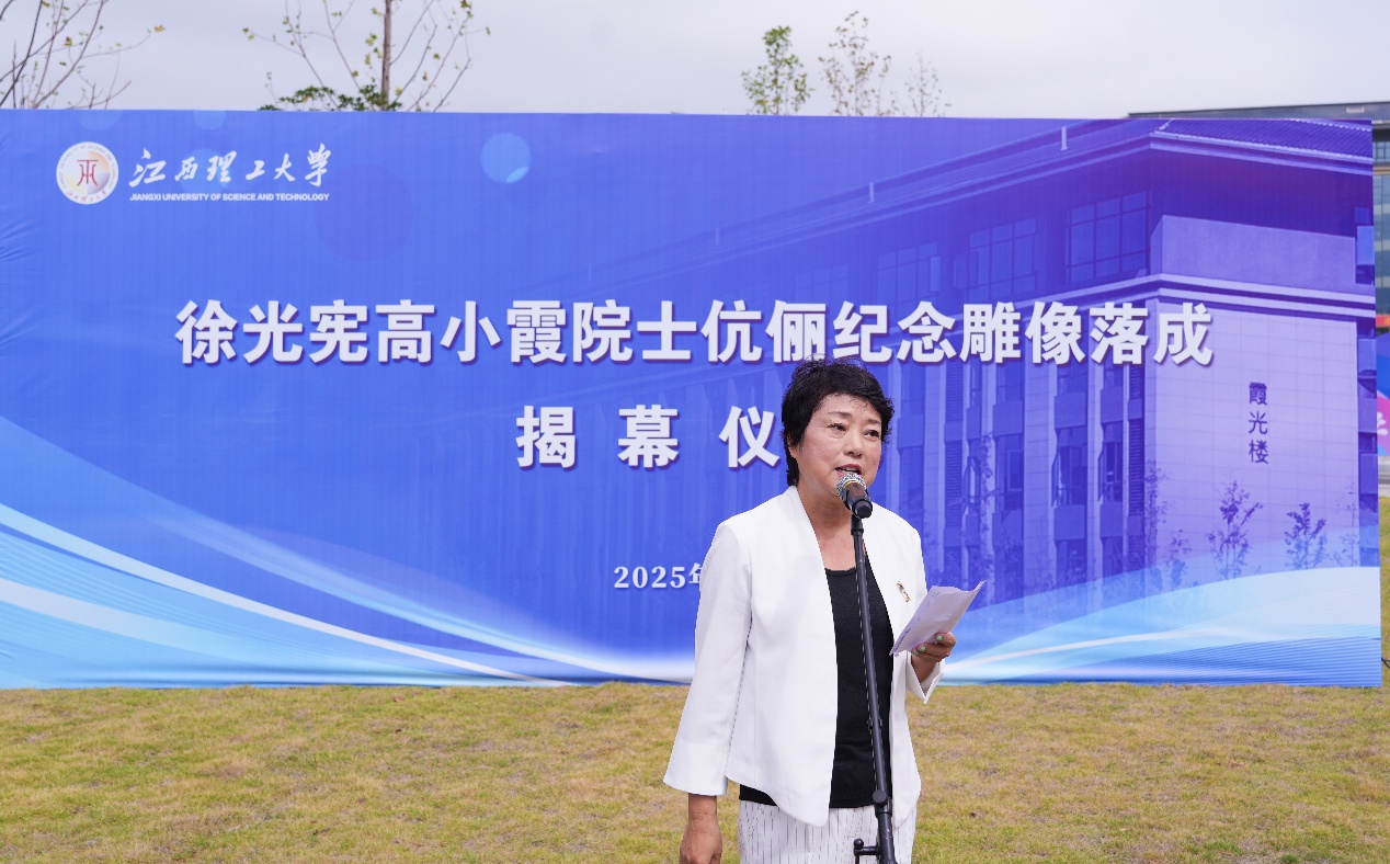 徐放代表家属向学校全体师生表达诚挚谢意。她提到父母与江西、特别是赣州的深厚缘分,并回忆父亲生前以科研助力江西打造世界稀土产业高地的心愿。她表示,塑像不仅凝固父母容貌,更承载其探索求真的科学精神。她还向现场师生分享了父母的科研与育人理念:即科研需兼备“360度的视野和1度的专注”,学问之路的三种境界为“昨夜西风凋碧树,独上高楼,望断天涯路”“衣带渐宽终不悔,为伊消得人憔悴”“众里寻他千百度,那人却在灯火阑珊处”等。她表示,如今看到稀土成为国家“富国利器”,相信父母定感欣慰,并再次感谢学校及所有参与雕像建设的人员。
