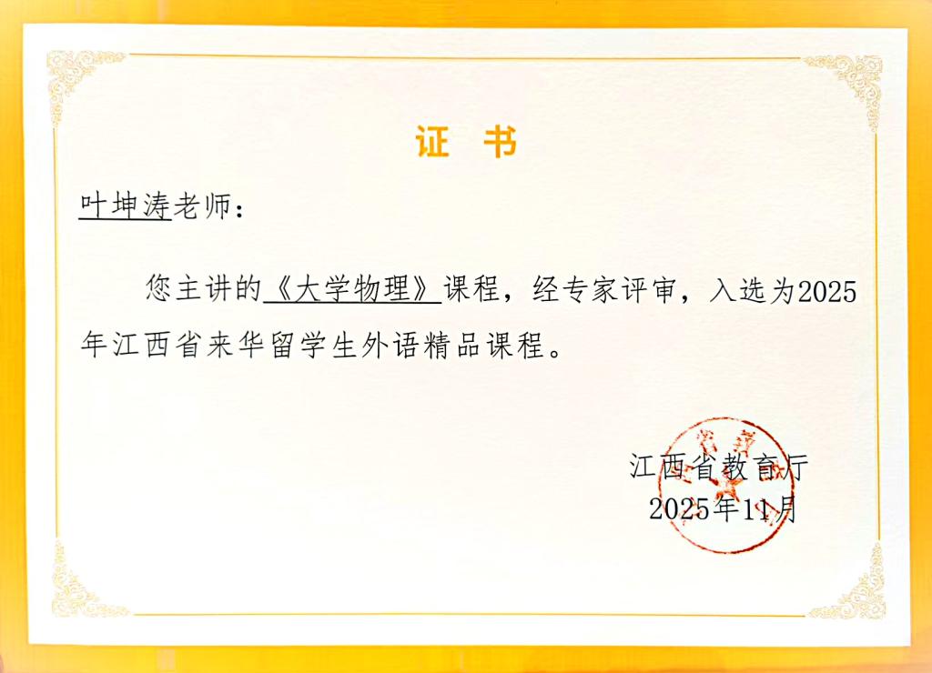 本网讯 11月26日至27日,首届江西省来华留学生外语精品课程展示活动暨教师英文授课能力提升研讨会在南昌举行。快猫 叶坤涛副教授主讲的《大学物理》课程成功入选首批江西省来华留学生外语精品课程。