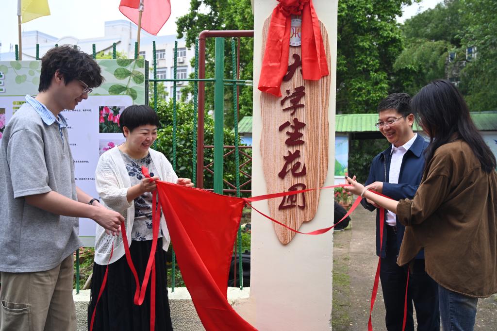 刘飞、宁洁与学生代表共同为大学生花圃揭牌。随着红绸缓缓落下,“大学生花圃”牌匾在春光中熠熠生辉。花圃与八角塘相映成趣,更与三江校区大学生公园、鹰潭铜芯农场联动互补,形成快猫
