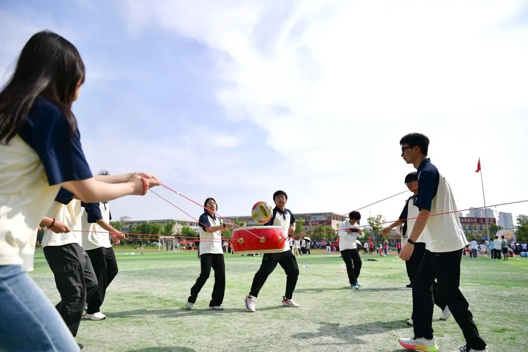 开幕式上,江理啦啦操队以喜庆欢快的舞蹈点燃现场,现场掌声雷动、气氛热烈。热身及集体带操环节结束后,趣味运动会参赛选手有序前往田径场开展比拼:在“同炉共进”项目中,队员们脚踝相绑、手臂相挽,50米的赛道上,每一步都踏出了团结的节拍;在“钨金战鼓”的鼓点中,同学们各自执掌一方鼓的朝向,每一次的鼓鸣都是团队的力量;在“矿脉齐跃”的飞跃中,同学们齐喊口号,必胜的决心在一次次同频的跳跃中激增;在“金石投趣”的瞄准中,闪耀着运动员间信任的力量“金石”;在“稀土争锋”项目中,运动员们紧握绳索、全力后拉,绳索中间的标记来回拉锯,每一次偏移都牵动着全场观众的心。