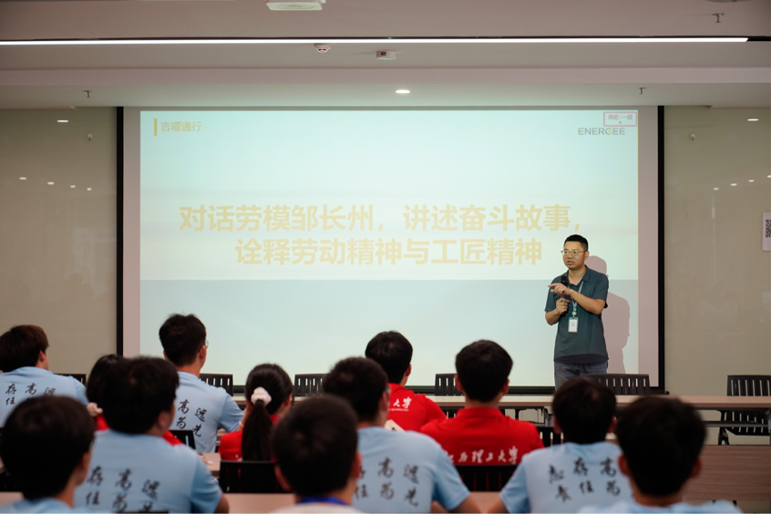 在耀能新能源,曾获“赣州市经开区十大工匠”荣誉的工程师邹长州,用朴实话语讲述11年深耕一线的奋斗历程。从化工厂设备维修,到宁德时代历练成长,再到加入耀能从零搭建产线、带领团队攻克50多项生产难题……当回忆到为攻克难题,曾连续两天睡在车间时,他说道:“世上无难事,只怕有心人,希望同学们多从基础做起,脚踏实地,用憋一口气的韧劲去克服难关。”邹长州始终以“凡事就怕认真”为信条,用精益求精的执着,把一个个技术瓶颈变成突破成果,用实干诠释新时代劳模担当。车辆工程专业赖莉文在听完讲述后,不禁赞叹:“邹工对于极致的执着、对责任的担当,正是我们需要学习的宝贵品质。”