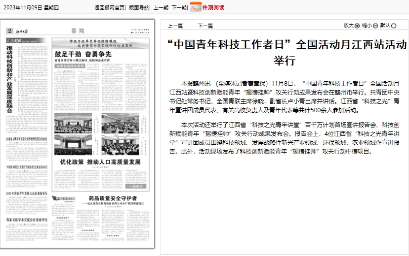 本次活动还举行了江西省“科技之光青年讲堂”百千万计划首场宣讲报告会、科技创新赋能青年“揭榜挂帅”攻关行动成果发布会。报告会上,4位江西省“科技之光青年讲堂”宣讲团成员围绕科技领域、发展战略性新兴产业领域、环保领域、农业领域作宣讲报告。此外,活动现场发布了科技创新赋能青年“揭榜挂帅”攻关行动中榜项目。