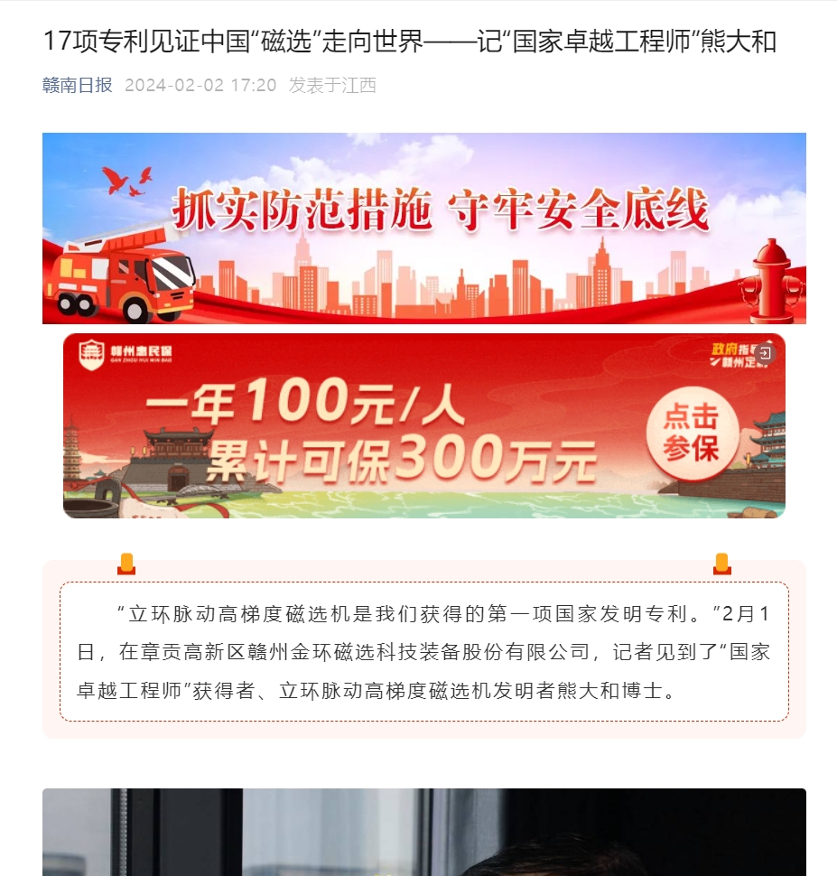“立环脉动高梯度磁选机是我们获得的第一项国家发明专利。”2月1日,在章贡高新区赣州金环磁选科技装备股份有限公司,记者见到了“国家卓越工程师”获得者、立环脉动高梯度磁选机发明者熊大和博士。