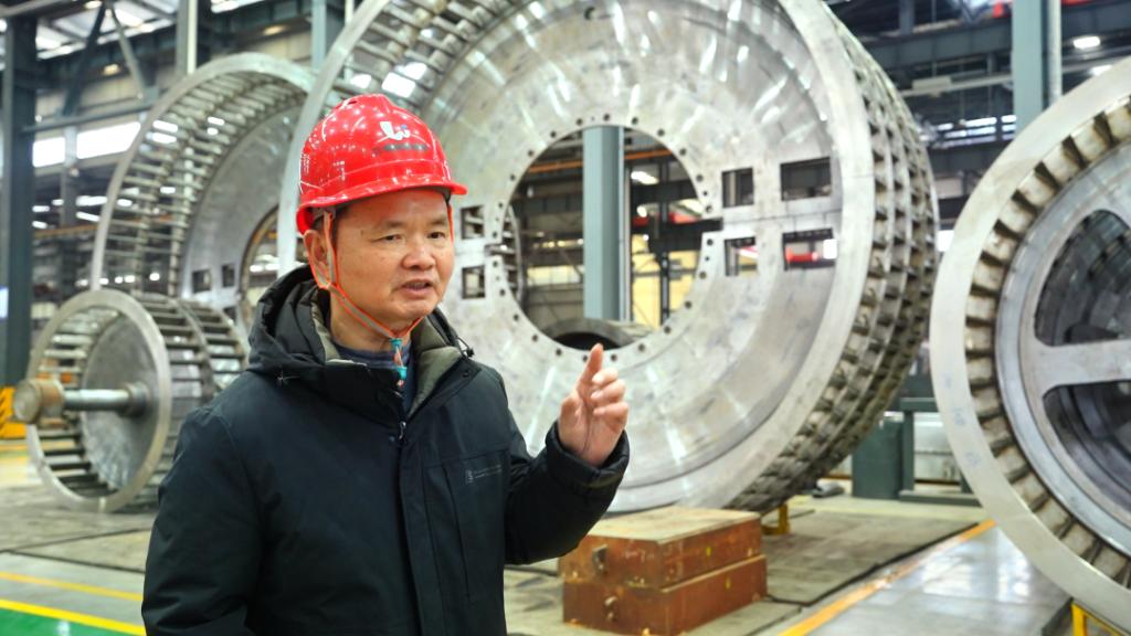 熊大和在制造立环脉动高梯度磁选机车间里讲述技术攻关的经验。