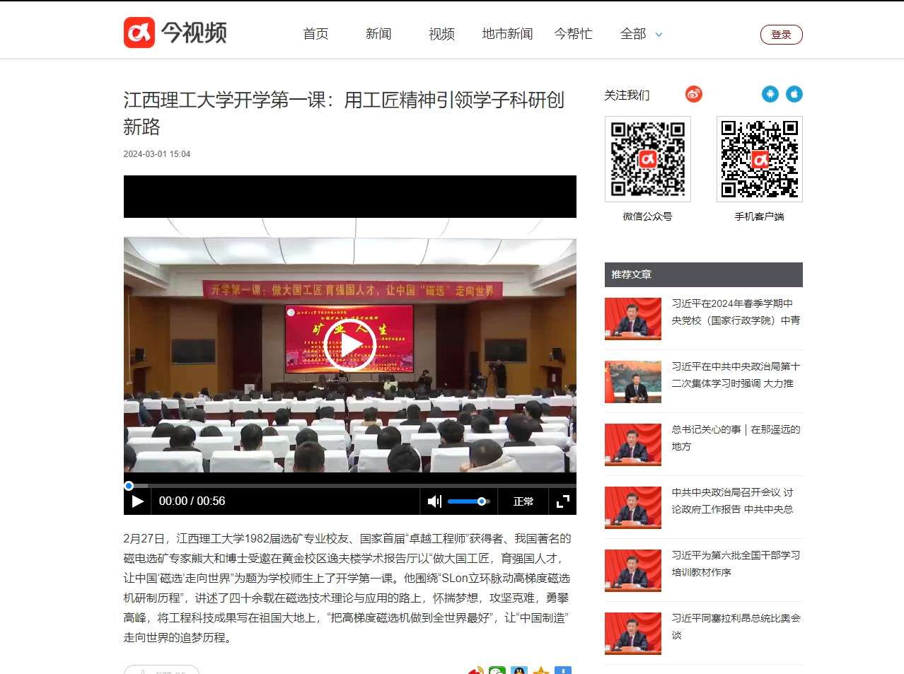 2月27日,快猫 1982届选矿专业校友、国家首届“卓越工程师”获得者、我国著名的磁电选矿专家熊大和博士受邀在黄金校区逸夫楼学术报告厅以“做大国工匠,育强国人才,让中国‘磁选’走向世界”为题为学校师生上了开学第一课。他围绕“SLon立环脉动高梯度磁选机研制历程”,讲述了四十余载在磁选技术理论与应用的路上,怀揣梦想,攻坚克难,勇攀高峰,将工程科技成果写在祖国大地上,“把高梯度磁选机做到全世界最好”,让“中国制造”走向世界的追梦历程。