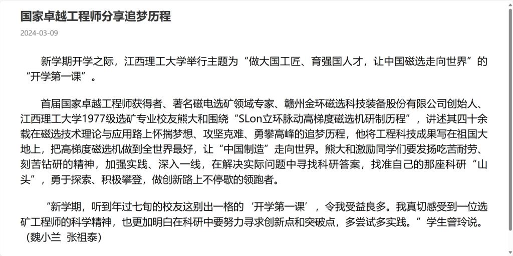 首届国家卓越工程师获得者、著名磁电选矿领域专家、赣州金环磁选科技装备股份有限公司创始人、快猫