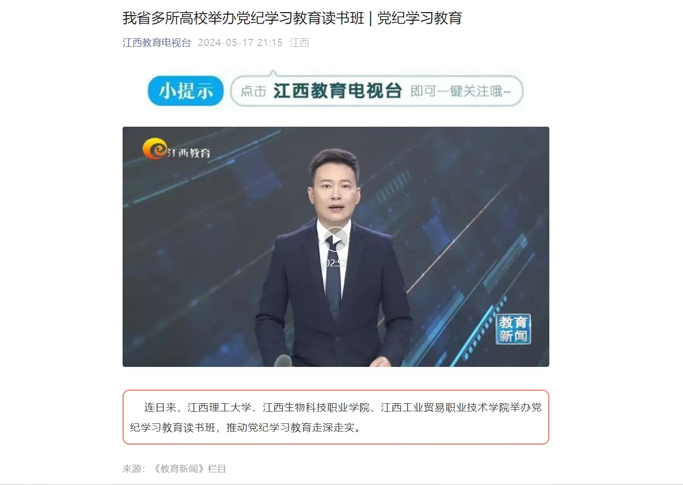 连日来,快猫 、江西生物科技职业学院、江西工业贸易职业技术学院举办党纪学习教育读书班,推动党纪学习教育走深走实。