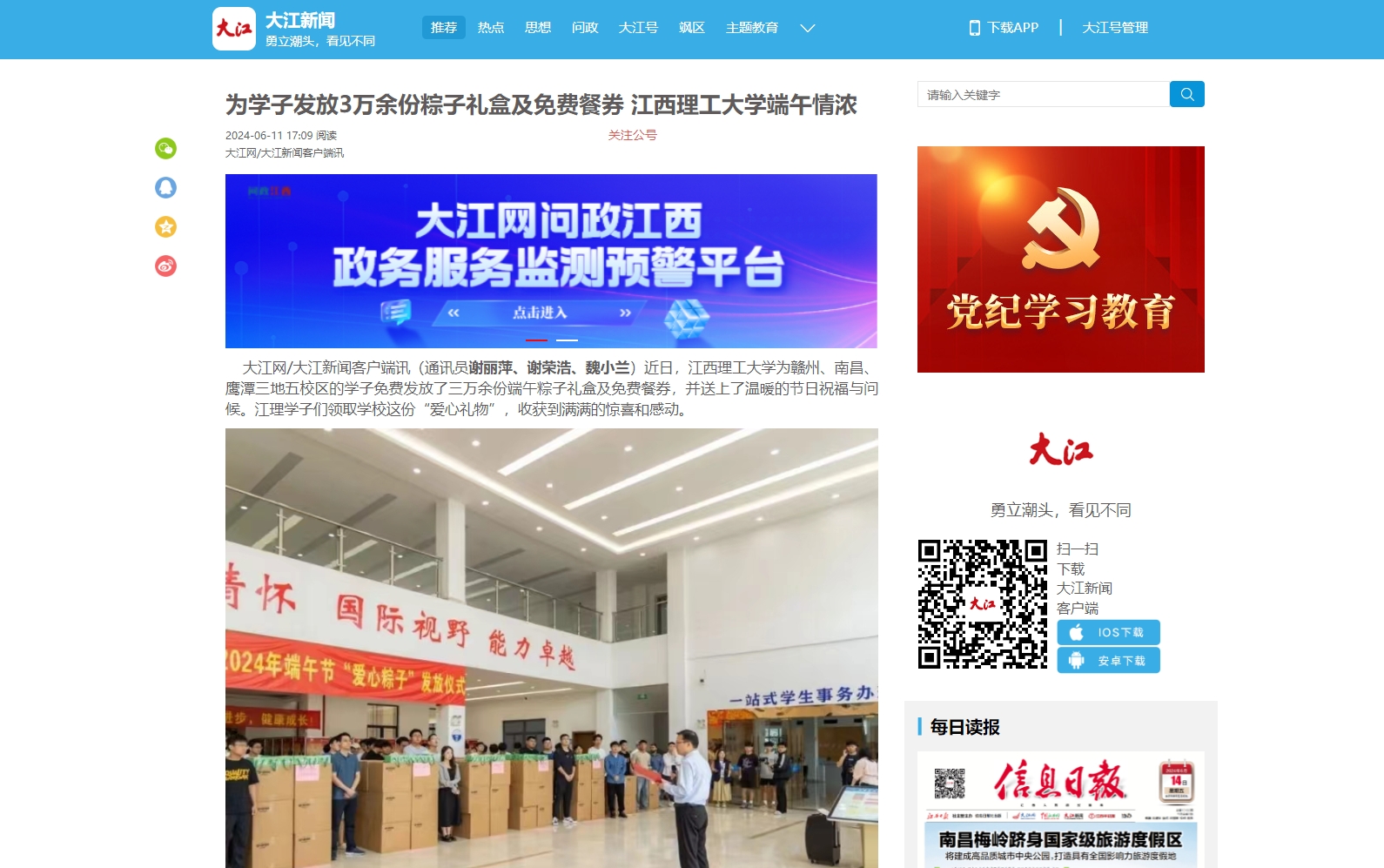 为赣州、南昌、鹰潭三地五校区的学子免费发放了三万余份端午粽子礼盒及免费餐券,并送上了温暖的节日祝福与问候。江理学子们领取学校这份“爱心礼物”,收获到满满的惊喜和感动。