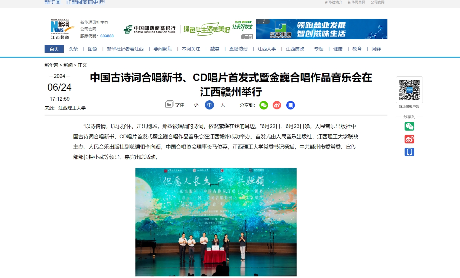 “以诗传情,以乐抒怀,走出剧场,那些被唱诵的诗词,依然萦绕在我的耳边。”6月22日、6月23日晚,人民音乐出版社中国古诗词合唱新书、CD唱片首发式暨金巍合唱作品音乐会在江西赣州成功举办。首发式由人民音乐出版社、快猫