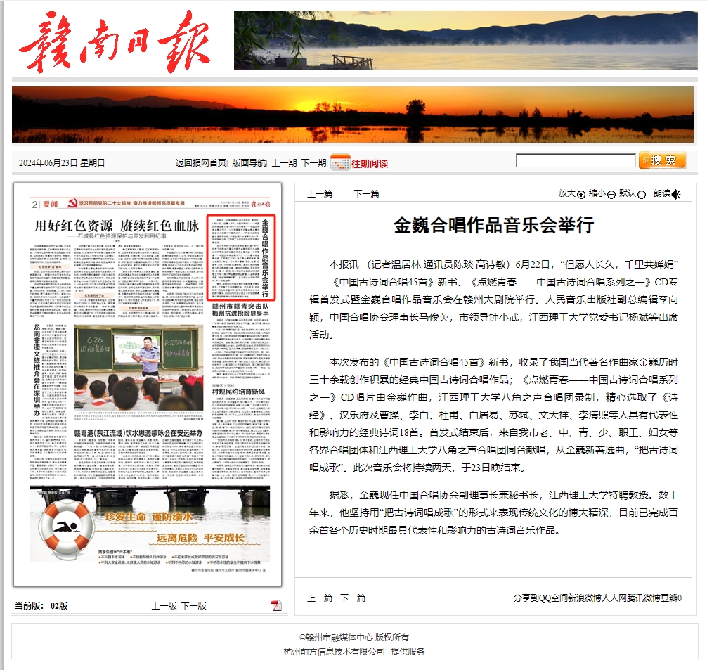 本报讯 (记者温居林 通讯员陈琰 高诗敏)6月22日,“但愿人长久,千里共婵娟”——《中国古诗词合唱45首》新书、《点燃青春——中国古诗词合唱系列之一》CD专辑首发式暨金巍合唱作品音乐会在赣州大剧院举行。人民音乐出版社副总编辑李向颖,中国合唱协会理事长马俊英,市领导钟小武,快猫