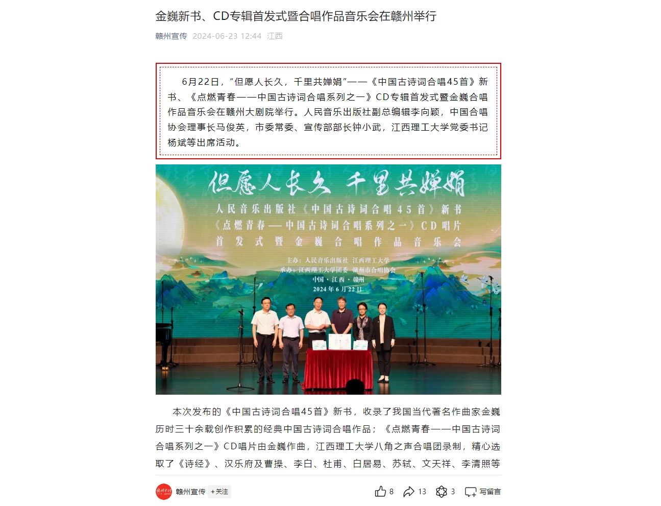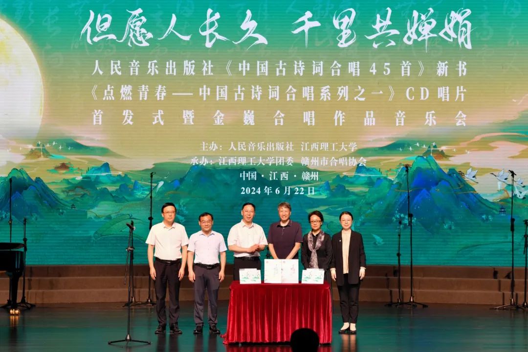 6月22日,“但愿人长久,千里共婵娟”——《中国古诗词合唱45首》新书、《点燃青春——中国古诗词合唱系列之一》CD专辑首发式暨金巍合唱作品音乐会在赣州大剧院举行。人民音乐出版社副总编辑李向颖,中国合唱协会理事长马俊英,市委常委、宣传部部长钟小武,快猫