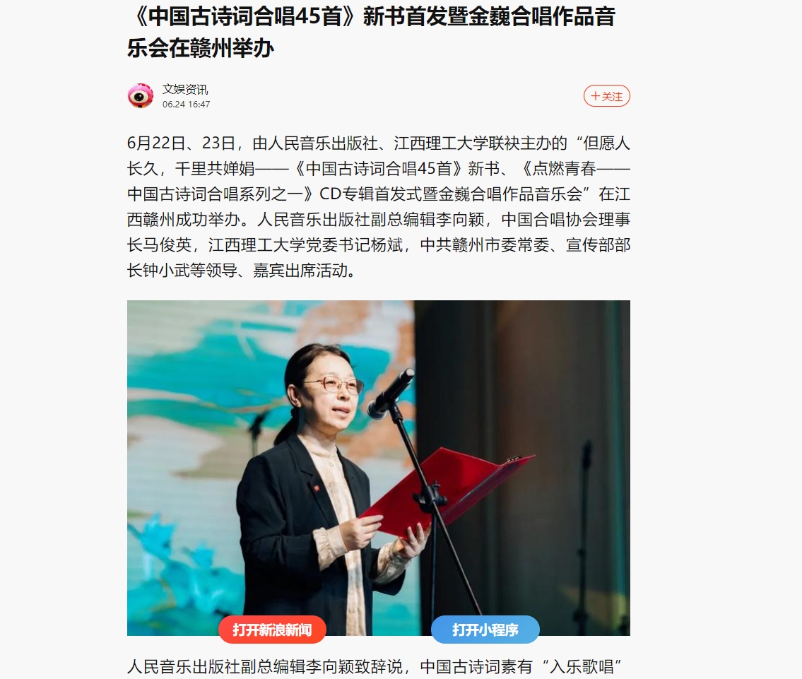 联袂主办的“但愿人长久,千里共婵娟——《中国古诗词合唱45首》新书、《点燃青春——中国古诗词合唱系列之一》CD专辑首发式暨金巍合唱作品音乐会”在江西赣州成功举办。人民音乐出版社副总编辑李向颖,中国合唱协会理事长马俊英,快猫