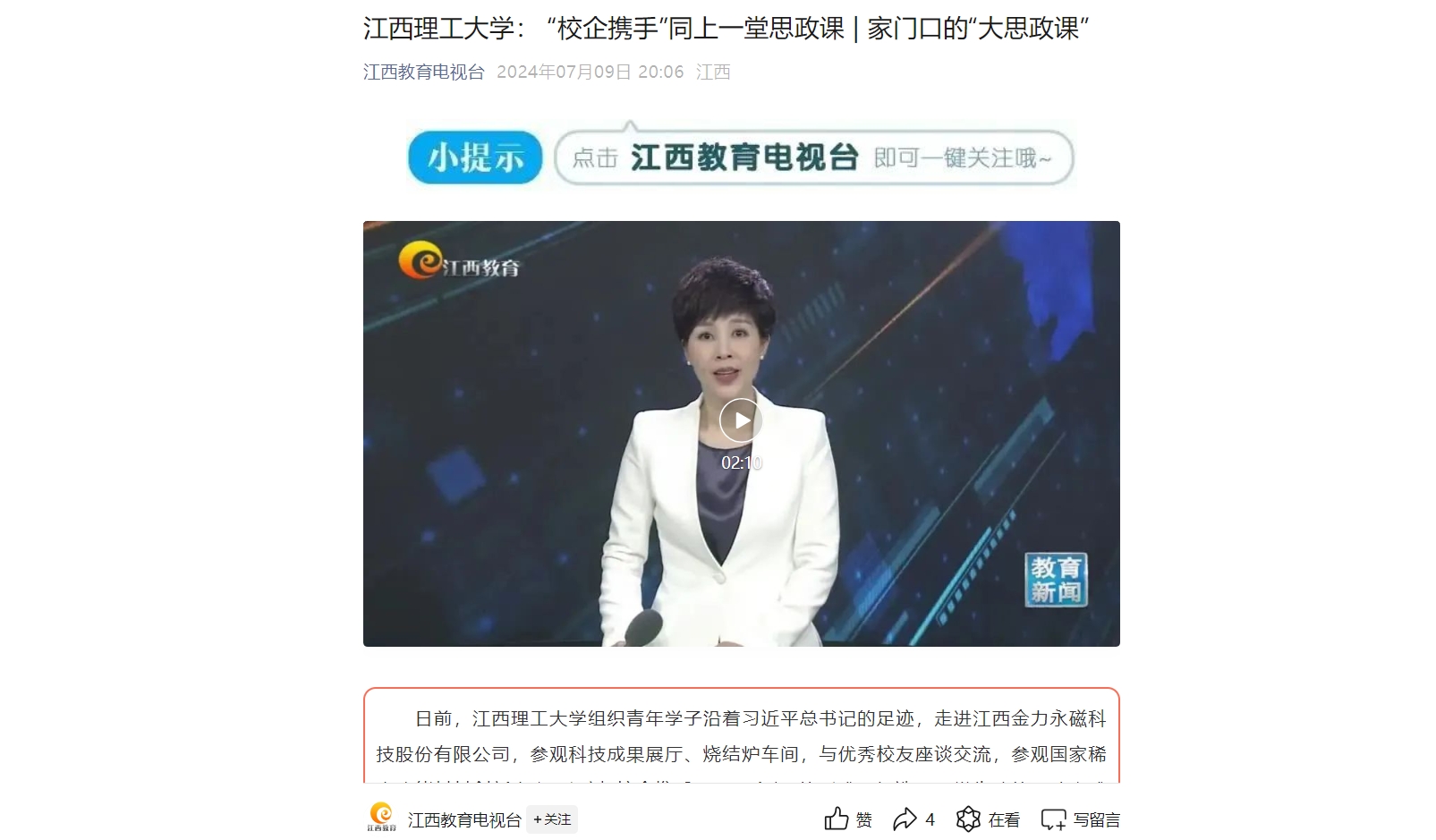 日前,快猫 组织青年学子沿着习近平总书记的足迹,走进江西金力永磁科技股份有限公司,参观科技成果展厅、烧结炉车间,与优秀校友座谈交流,参观国家稀土功能材料创新中心,通过“校企携手,一课多师”的形式,打造了一堂生动的思政实践大课。