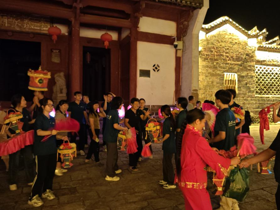 到了村民们最期待的“茶篮灯”表演环节,同学们与村内“茶篮灯”村民表演队“同台竞技”,唱起唱词,挥动彩扇,手托彩灯与观看的村民们不断互动。用最青春、最真挚的“茶篮灯”表演丰富着古村村民的精神文明世界,让“非遗”文化在青春唱跳中焕发崭新生命力。