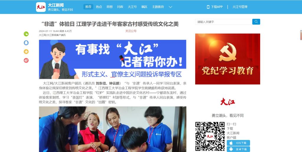 冶金工程学院“红炉”实践队走进中国历史文化名村——宁都县东龙村,通过体验客家刺绣、学习“茶篮灯”表演、“桥梆灯”村游等形式,与“非遗”传承人同台表演,感受传统文化之美,探寻客家“非遗”文化的“出圈”密钥。