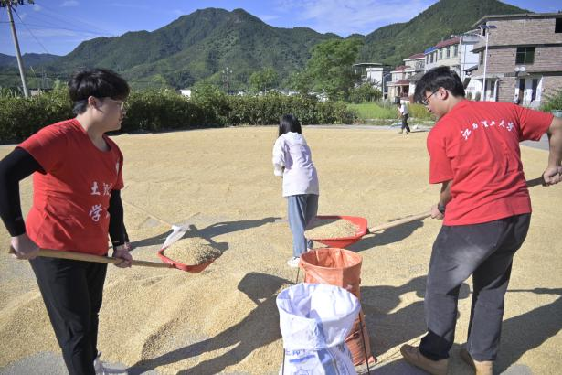 “你来扫,我来铲”“你负责这边,我去那边”“再来几个人支撑一下麻袋”,在唐虞村稻谷地,队员们现场帮助当地村民收晾晒的稻谷。农民伯伯耐心指导、手把手教,队员们在一次次尝试后逐渐掌握技巧。农田刘老板还热情介绍了再生稻、早稻的特点以及种植和收割周期。太阳高照,汗水浸透了他们的衣裳,在所有的稻谷收纳完毕后,实践队员张赫感慨道:“粒粒皆辛苦,每一粒米都是农民伯伯辛勤耕耘的结果,我们应该向劳动人民致敬,珍惜每一粒粮食,努力科学文化知识,为振兴乡村贡献自己的青春力量。”康捌生也希望实践队多多参与乡村实践,传播乡村文化,创新乡村发展模式。