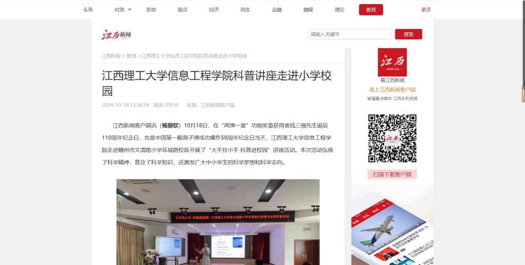 信息工程学院走进赣州市文清路小学环城路校区开展了“大手拉小手 科普进校园”讲座活动。本次活动弘扬了科学精神,普及了科学知识,还激发广大中小学生的科学梦想和科学志向。