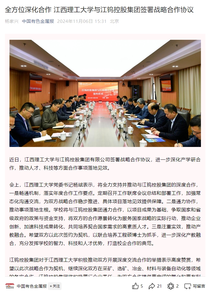 与江钨控股集团有限公司签署战略合作协议,进一步深化产学研合作,推动人才、科技等方面合作事项落地见效。