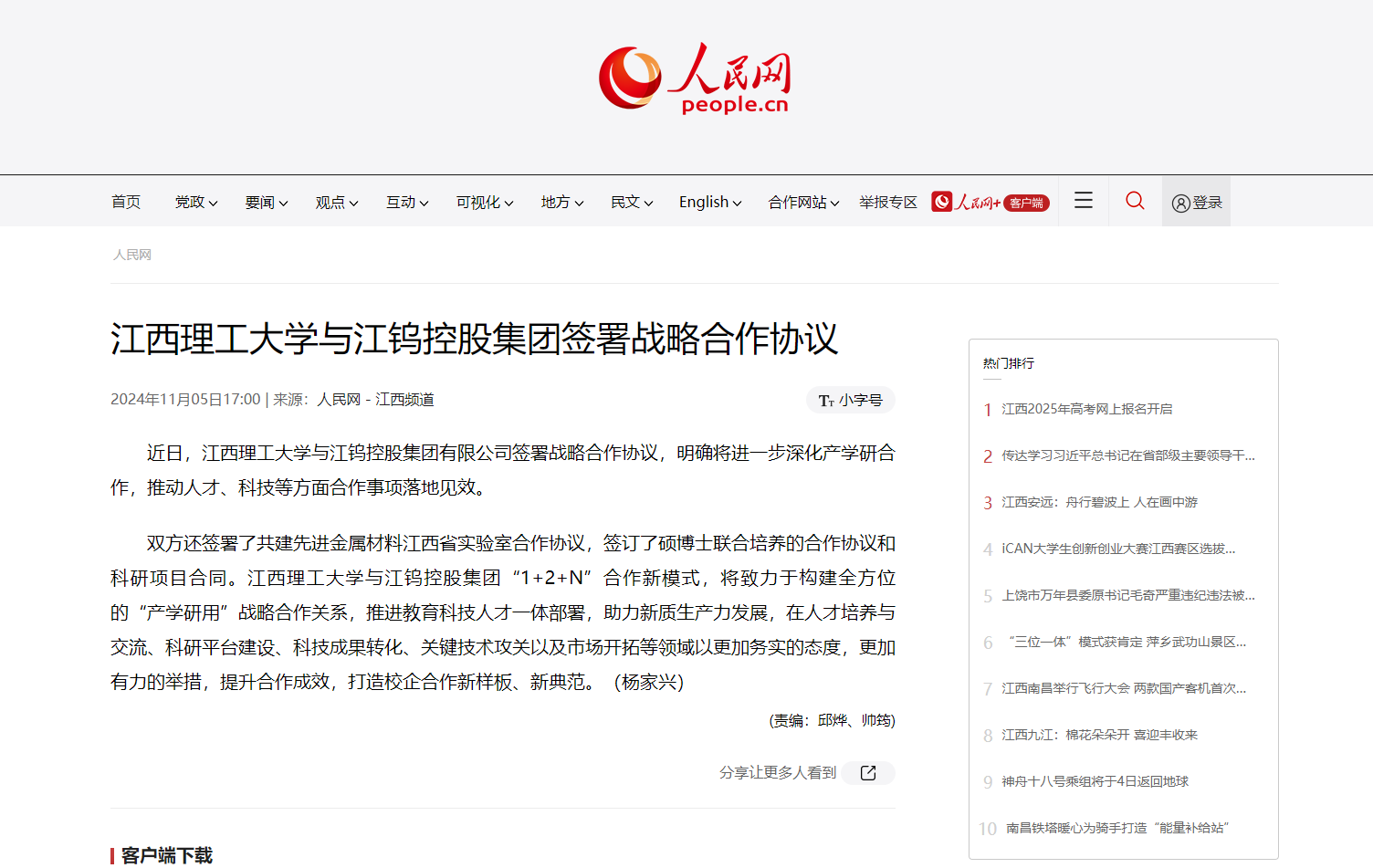 双方还签署了共建先进金属材料江西省实验室合作协议,签订了硕博士联合培养的合作协议和科研项目合同。快猫 与江钨控股集团“1+2+N”合作新模式,将致力于构建全方位的“产学研用”战略合作关系,推进教育科技人才一体部署,助力新质生产力发展,在人才培养与交流、科研平台建设、科技成果转化、关键技术攻关以及市场开拓等领域以更加务实的态度,更加有力的举措,提升合作成效,打造校企合作新样板、新典范。