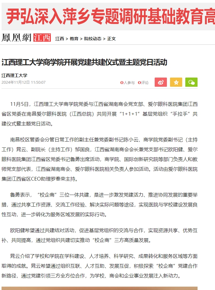 商学院党委与江西省湖南商会党支部、爱尔眼科医院集团江西省区党委在南昌爱尔眼科医院(江西总院)共同开展“1+1+1”基层党组织“手拉手”共建仪式暨主题党日活动。