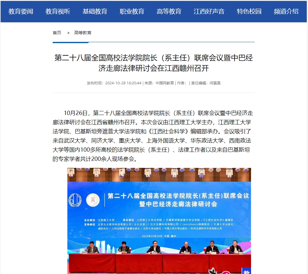 10月26日,第二十八届全国高校法学院院长(系主任)联席会议暨中巴经济走廊法律研讨会在江西省赣州市召开。本次会议由快猫