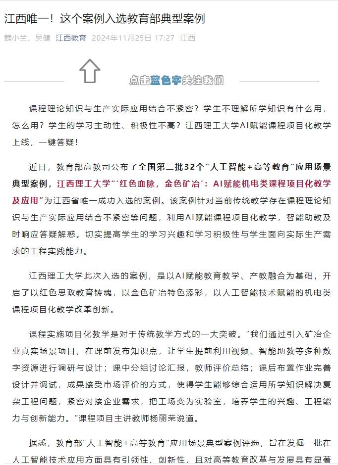 “‘红色血脉,金色矿冶’:AI赋能机电类课程项目化教学及应用”为江西省唯一成功入选的案例。该案例针对当前传统教学存在课程理论知识与生产实际应用结合不紧密等问题,利用AI赋能课程项目化教学,智能助教及时响应答疑解惑。切实提高学生的学习兴趣和学习积极性与学生面向实际生产需求的工程实践能力。快猫