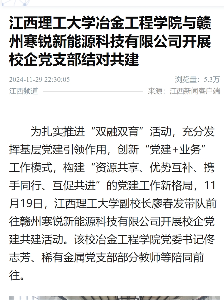 副校长廖春发带队前往赣州寒锐新能源科技有限公司开展校企党建共建活动。该校冶金工程学院党委书记佟志芳、稀有金属党支部部分教师等陪同前往。