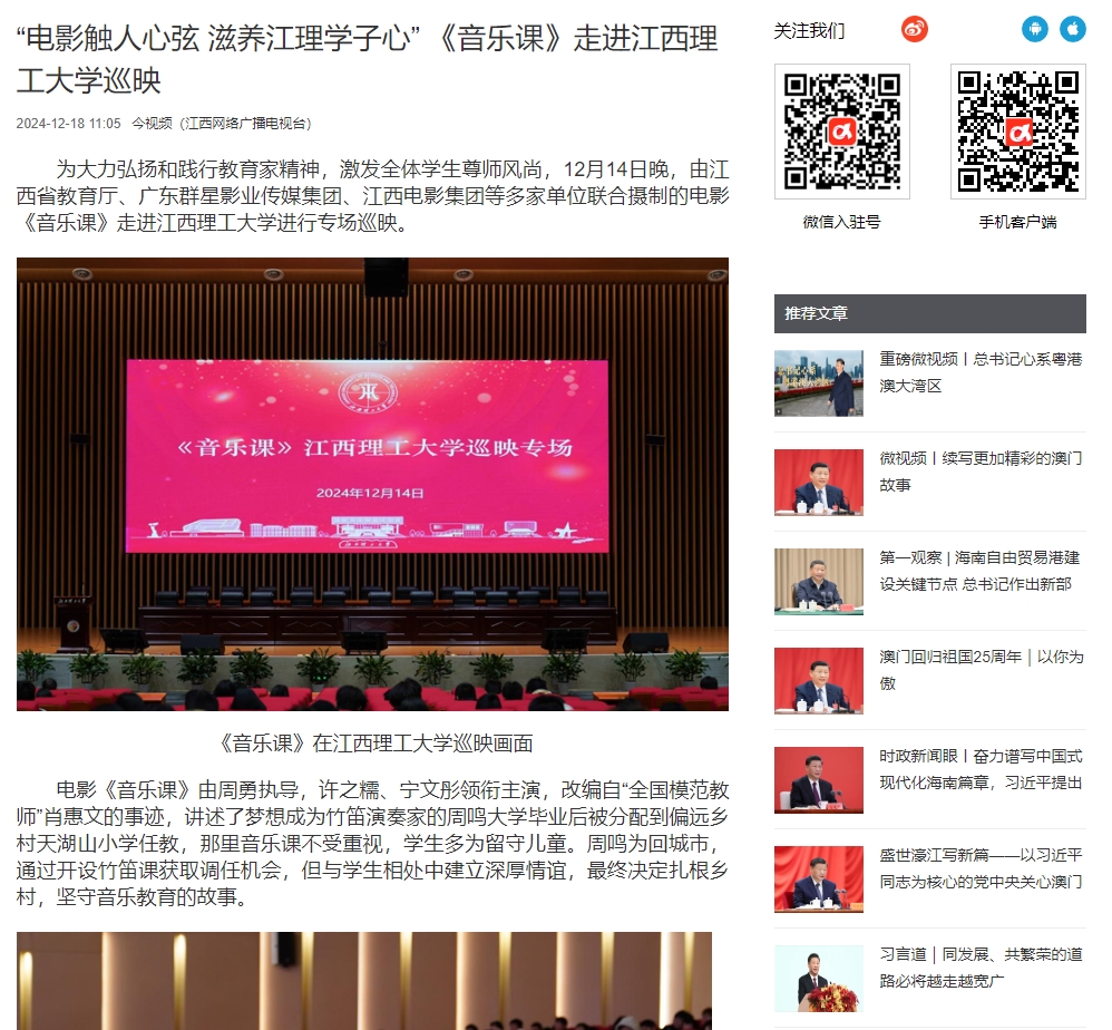 为大力弘扬和践行教育家精神,激发全体学生尊师风尚,12月14日晚,由江西省教育厅、广东群星影业传媒集团、江西电影集团等多家单位联合摄制的电影《音乐课》走进快猫