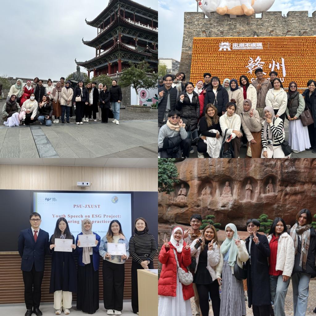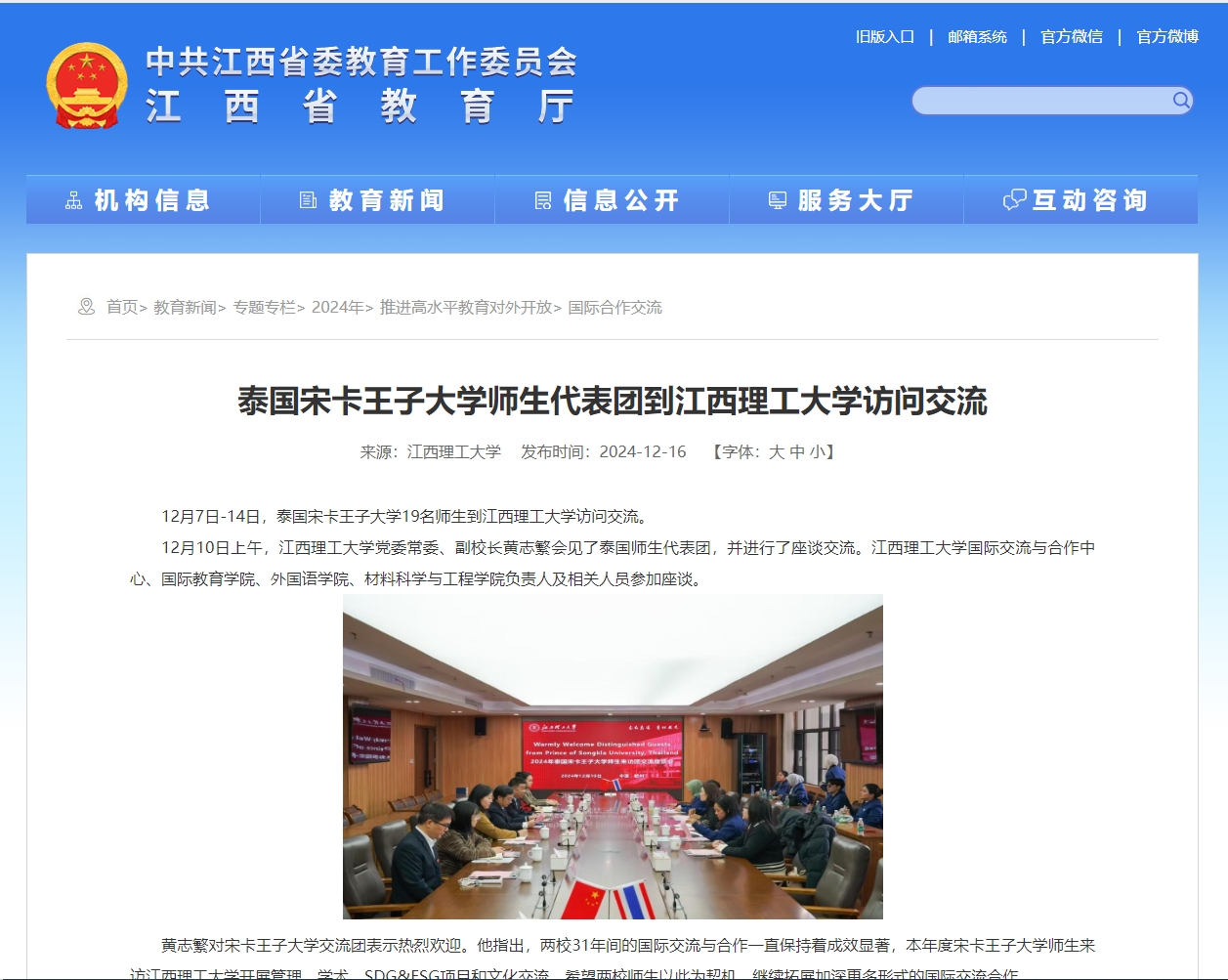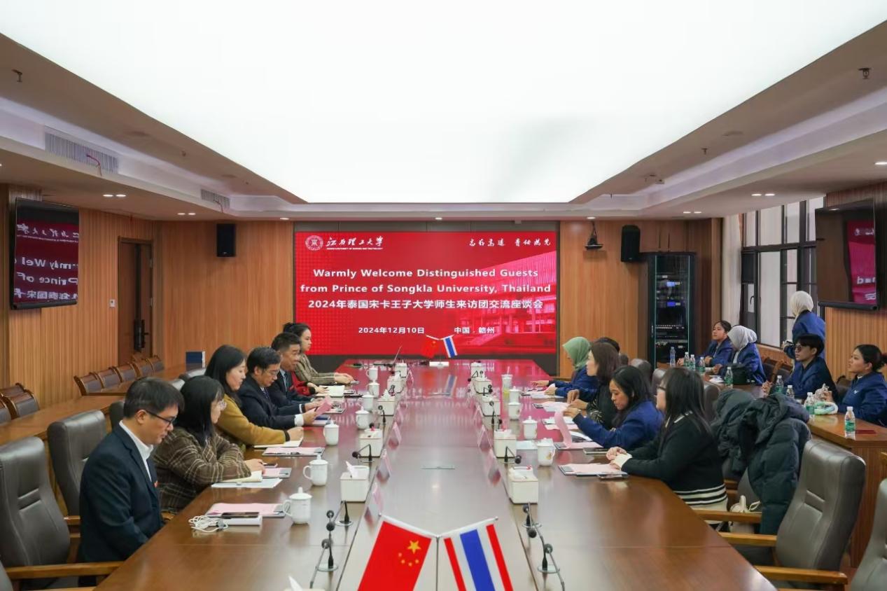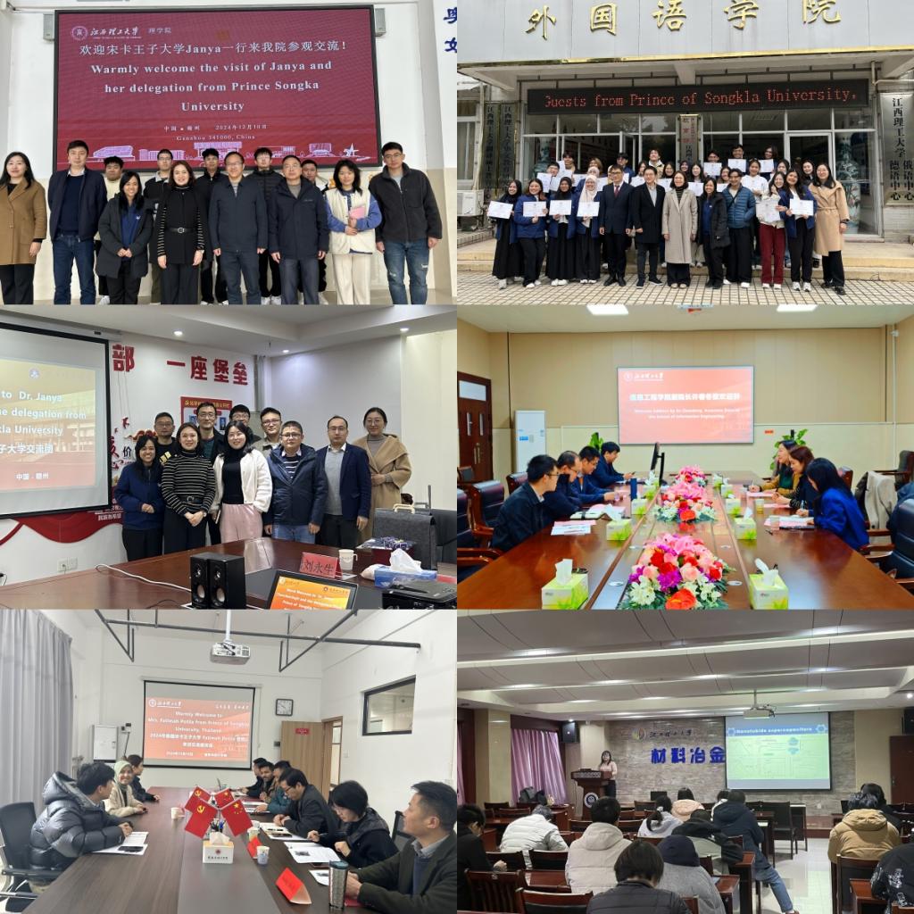 信息工程学院、理学院、材料科学与工程学院、建筑与设计学院、外国语学院、化学化工学院开展了学术、管理交流,并赴“江南第一石窟”通天岩、八境台、古浮桥、古城墙、江南宋城、上犹阳明湖等地感受生态、人文的氛围,了解中华优秀传统文化,同时,还举办了中泰文化交流晚会,通过《Rabum Kritdapinihan》《Thailand land of rich culture》《千年的祈祷》《流水桃花》《Finale Show》等节目与游戏互动,进一步加深了两校师生的友谊。