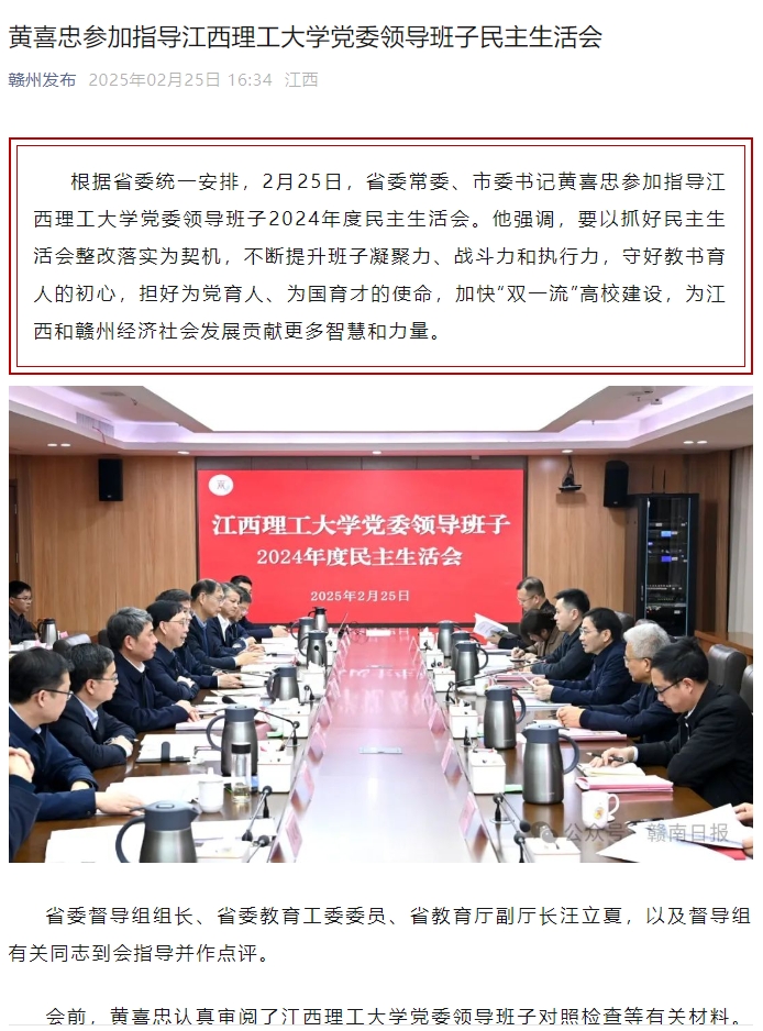 党委领导班子2024年度民主生活会。他强调,要以抓好民主生活会整改落实为契机,不断提升班子凝聚力、战斗力和执行力,守好教书育人的初心,担好为党育人、为国育才的使命,加快“双一流”高校建设,为江西和赣州经济社会发展贡献更多智慧和力量。