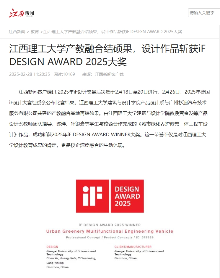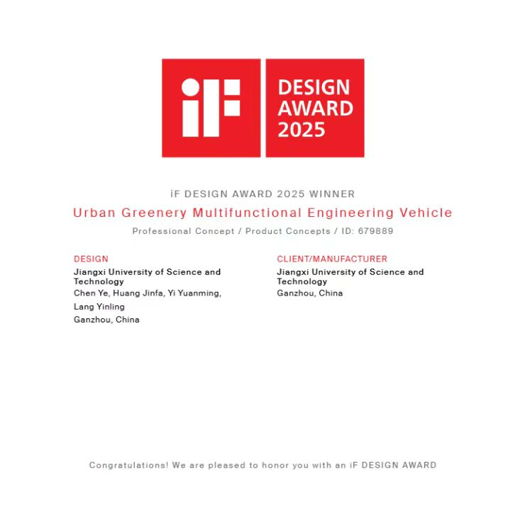 建筑与设计学院教授黄金发等产品设计系教师团队指导,陈烨、叶银豪等学生与校企合作完成的《城市绿化养护修剪一体工程车设计》作品,成功斩获2025年iF DESIGN AWARD WINNER大奖。这一荣誉不仅是对快猫