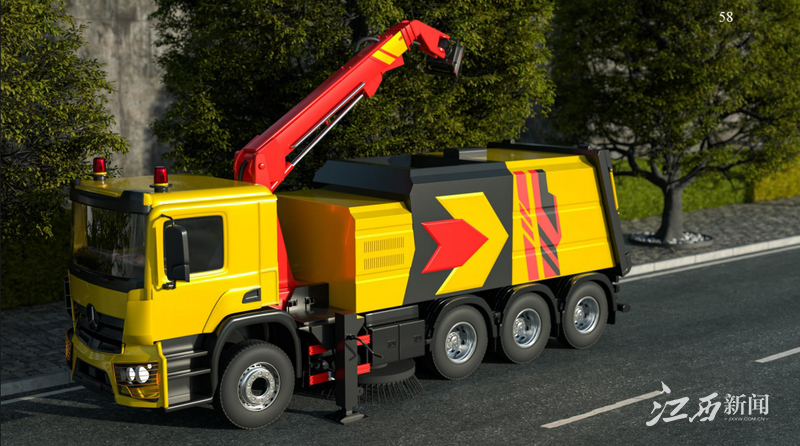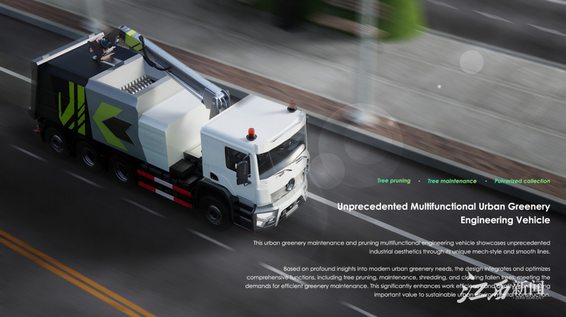 建筑与设计学院教师团队的指导下,学生深入参与企业实际项目,将课堂所学与行业需求紧密结合。此次获奖的作品《城市绿化养护修剪一体工程车设计》,以“机械风暴”为灵感,融合工业风格与机械元素,通过流畅的线条和独特的功能整合,展现了现代工业美学与实用性的完美结合。其前部设计借鉴了装甲车的坚固性与跑车的流线型,不仅优化了空气动力学性能,还赋予了车辆强烈的视觉冲击力。同时,机械臂与底盘的设计通过形式解构与重组,打破了传统工程车的刻板印象,为城市绿化维护提供了高效、创新的解决方案。