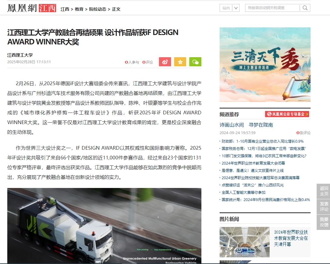 建筑与设计学院黄金发教授等产品设计系教师团队指导,陈烨、叶银豪等学生与校企合作完成的《城市绿化养护修剪一体工程车设计》作品,斩获2025年iF DESIGN AWARD WINNER大奖。这一荣誉不仅是对快猫
