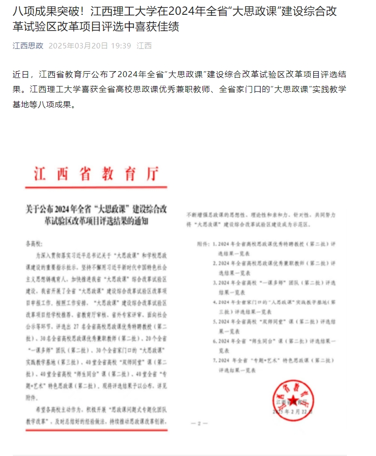 据了解,以“高校思政课问题式专题化团队教学改革”为主题的“大思政课”综合改革试验区建设,是江西省聚焦办好思政课,努力破解思政课改革创新中的难点堵点,让思政课充满生机活力的重要举措。