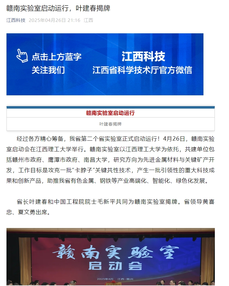 经过各方精心筹备,我省第二个省实验室正式启动运行!4月26日,赣南实验室启动会在快猫